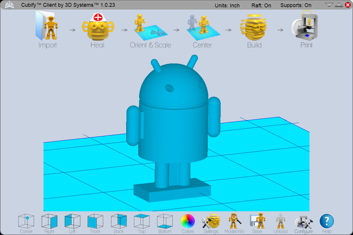 In the case of the dinosaur I could scale it down the model in the Cubify Client software to a size small enough so that he could clasp it in his tiny hand as he slept. But the Android was a different story. Take a look at its features.