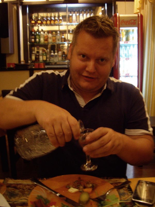 Eugene setting his vodka on fire before gulping it down. Martyn and I couldn’t find the guts to do that.